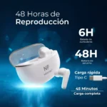 🎧48 HORAS SIN CARGAR 🎧 Con estos Auriculares, olvídate de cargarlos cada día. El Estuche de carga rápida tiene una autonomía de 48 horas (5 días si los usas 8 h). Los auriculares tienen un micrófono incorporado con reducción de ruido. La batería de los auriculares es de 6 horas.