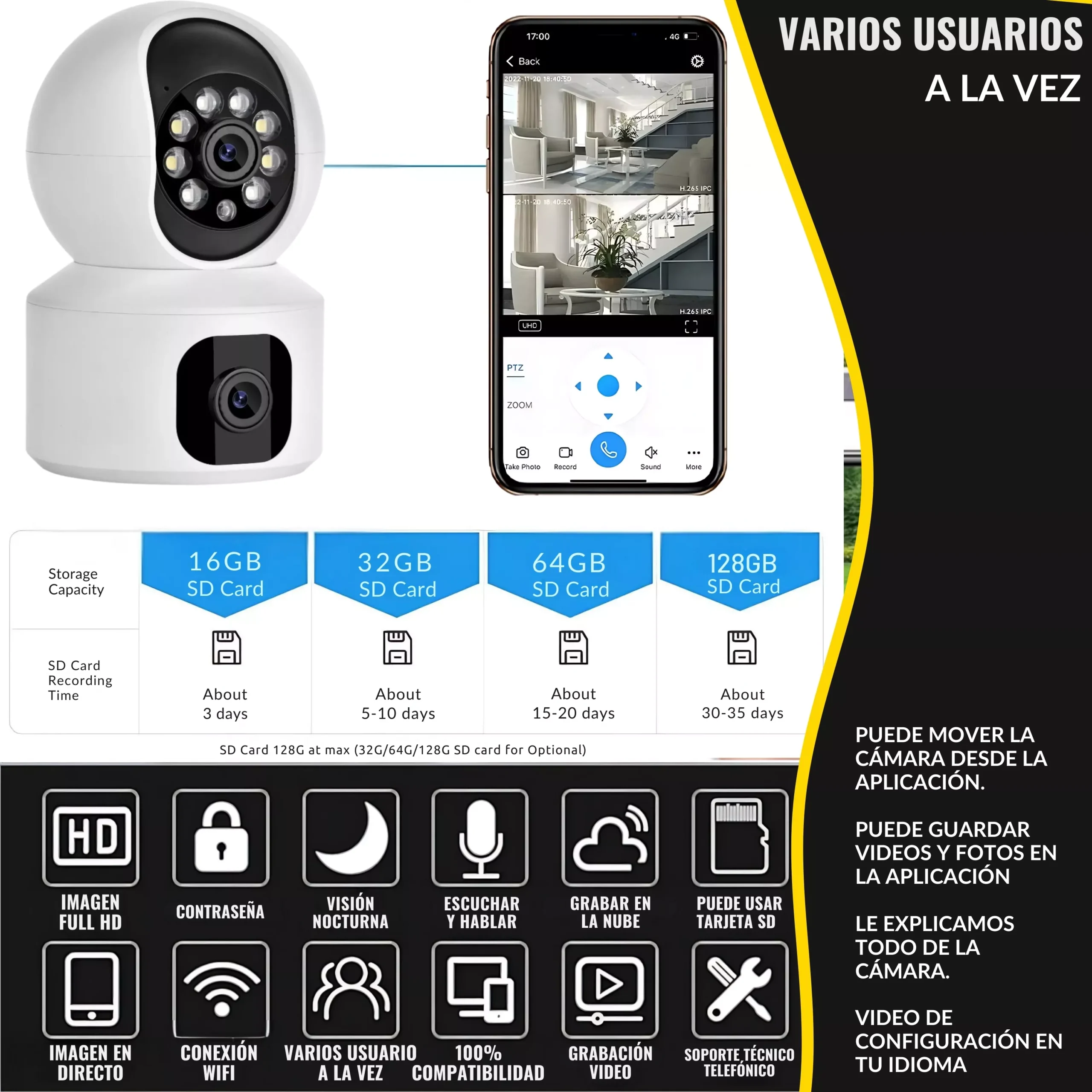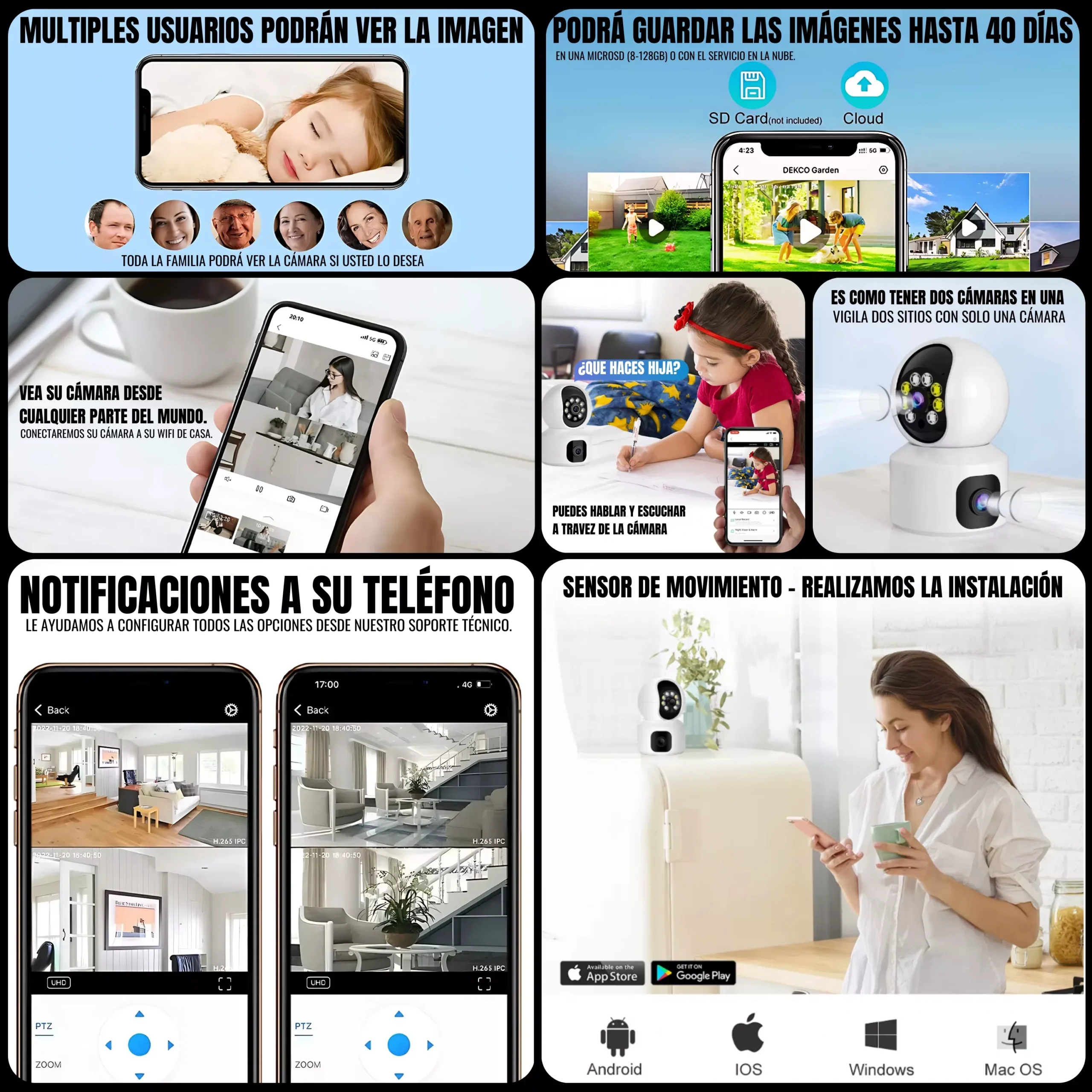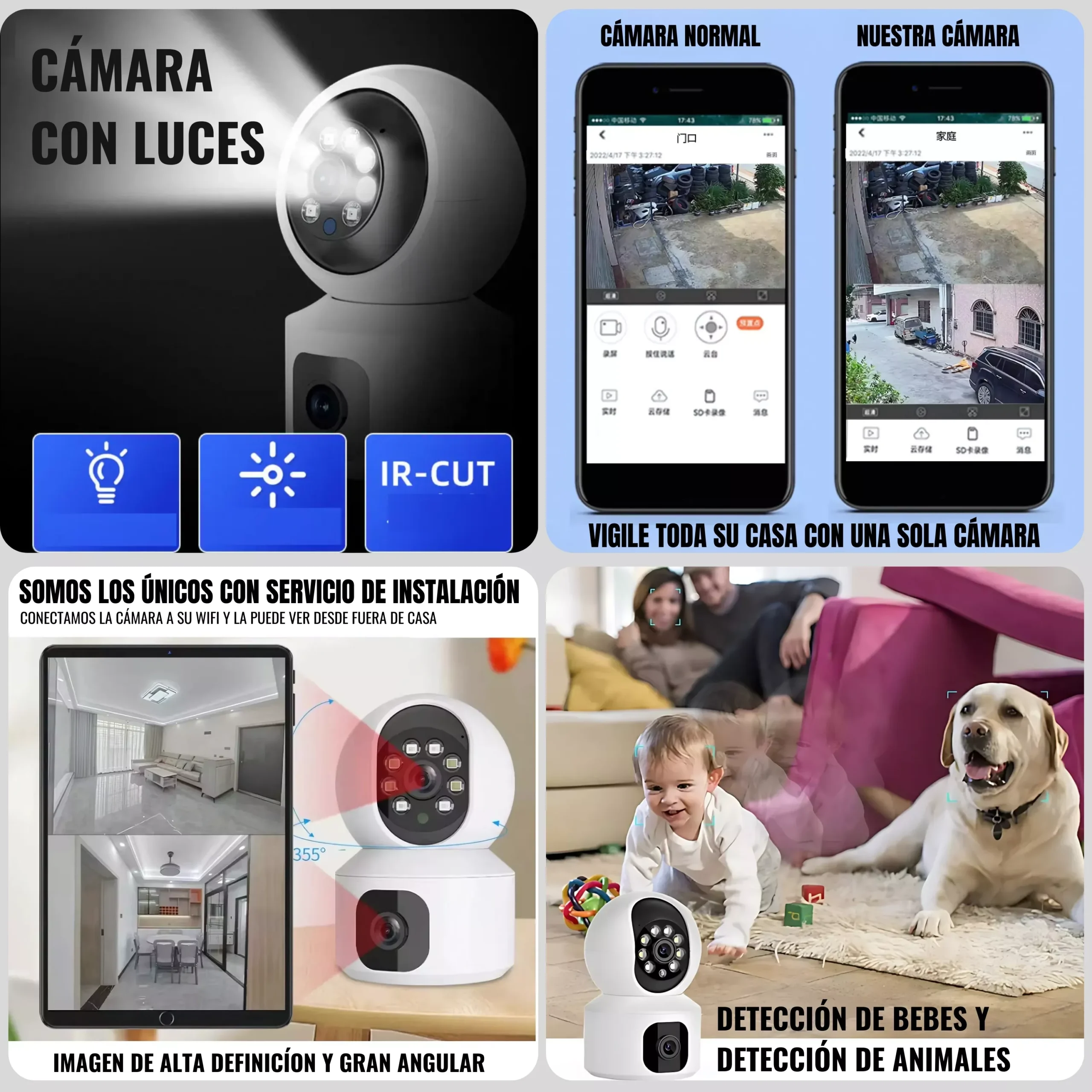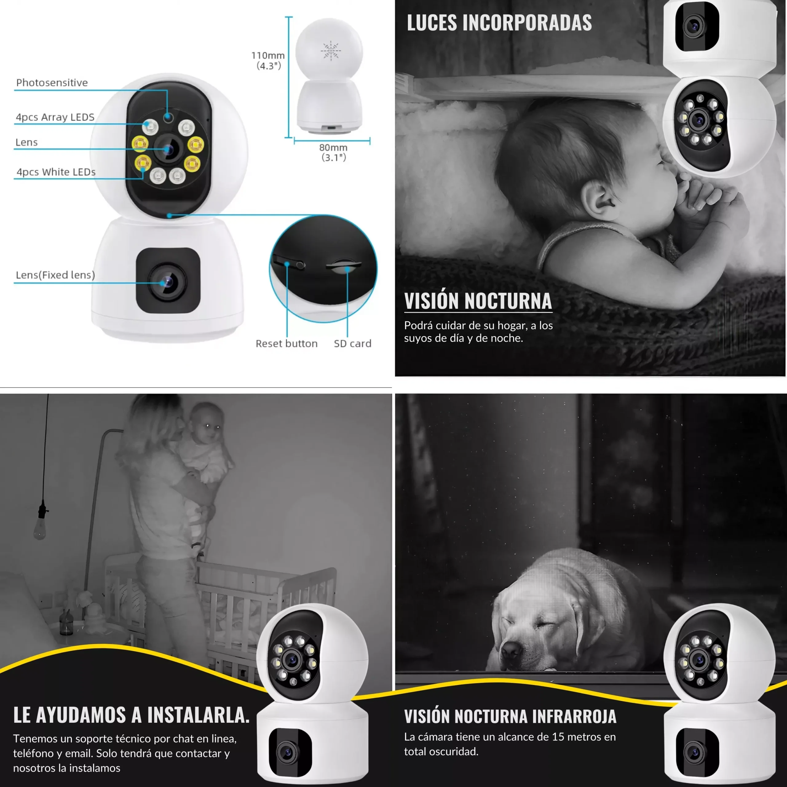 📹 VIGILE Y PROTEJA SU CASA 24 HORAS – DOBLE CÁMARA 📹 Nuestras cámaras vigilancia domicilio wifi son las mejores para el interior; en comparación con una cámara Tapo c210(cámara de vigilancia wifi interior) nuestra cámara de seguridad interior tiene: Dos lentes, tiene luces, envía notificaciones, la instalamos nosotros, tiene alarma y puede grabar continuamente. Además, esta videocámara vigilancia trae dos lentes, lo que quiere decir que tendrá dos cámaras en una sola.
