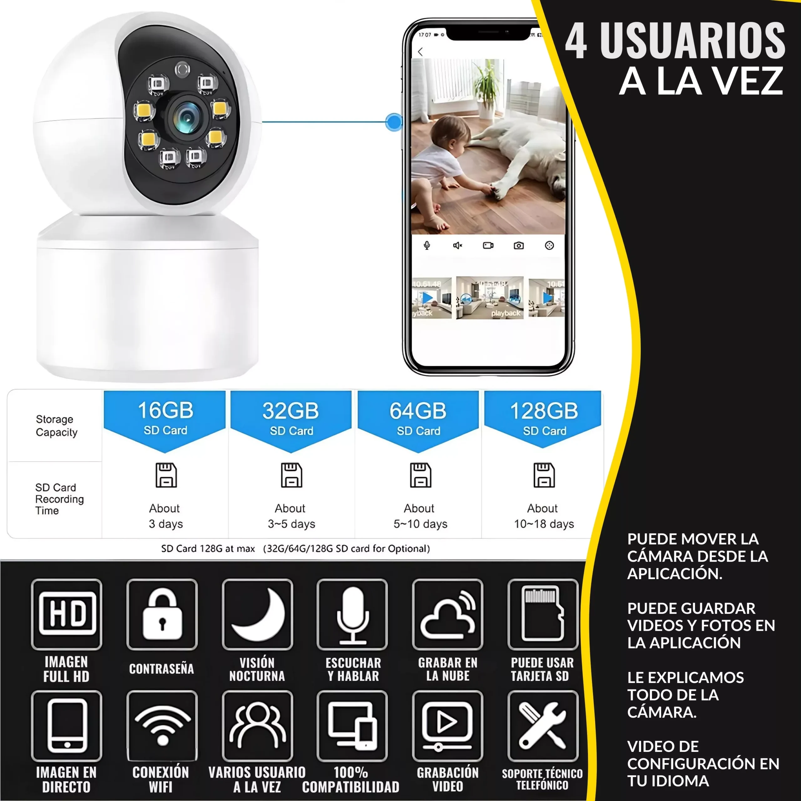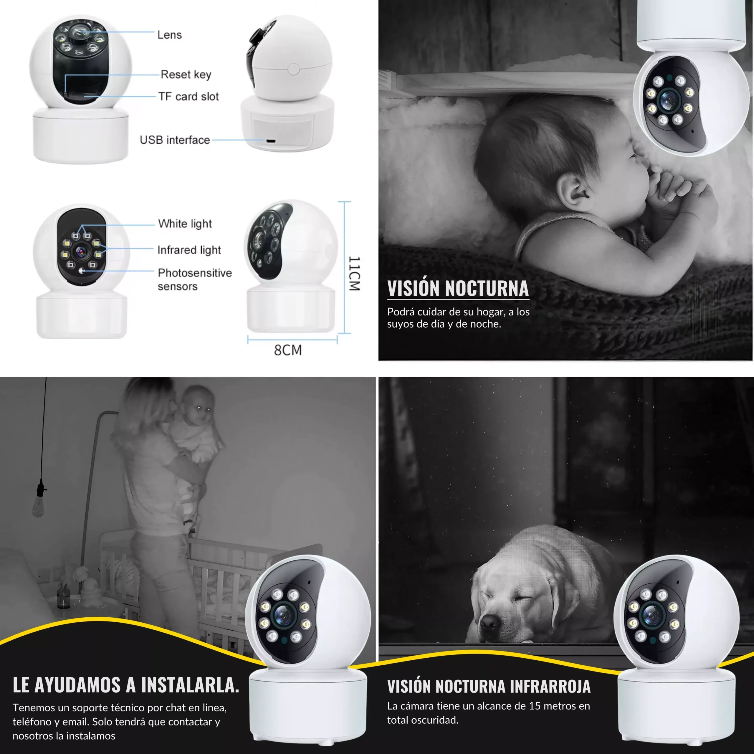 📹 NOSOTROS INSTALAMOS SU CÁMARA 📹 La cámara para vigilar bebés no da ninguna señal visual de estar transmitiendo en directo. Siempre parecerá que este sin transmitir. También nuestras cámaras incorporan la posibilidad de hacer un pequeño circuito de vigilancia incorporando 4 cámaras en una misma APP y pudiendo ver estas en directo al mismo tiempo en varios dispositivos. ¡Tenemos soporte técnico! Ellos instalarán la Cámara de Bebé por ti.
