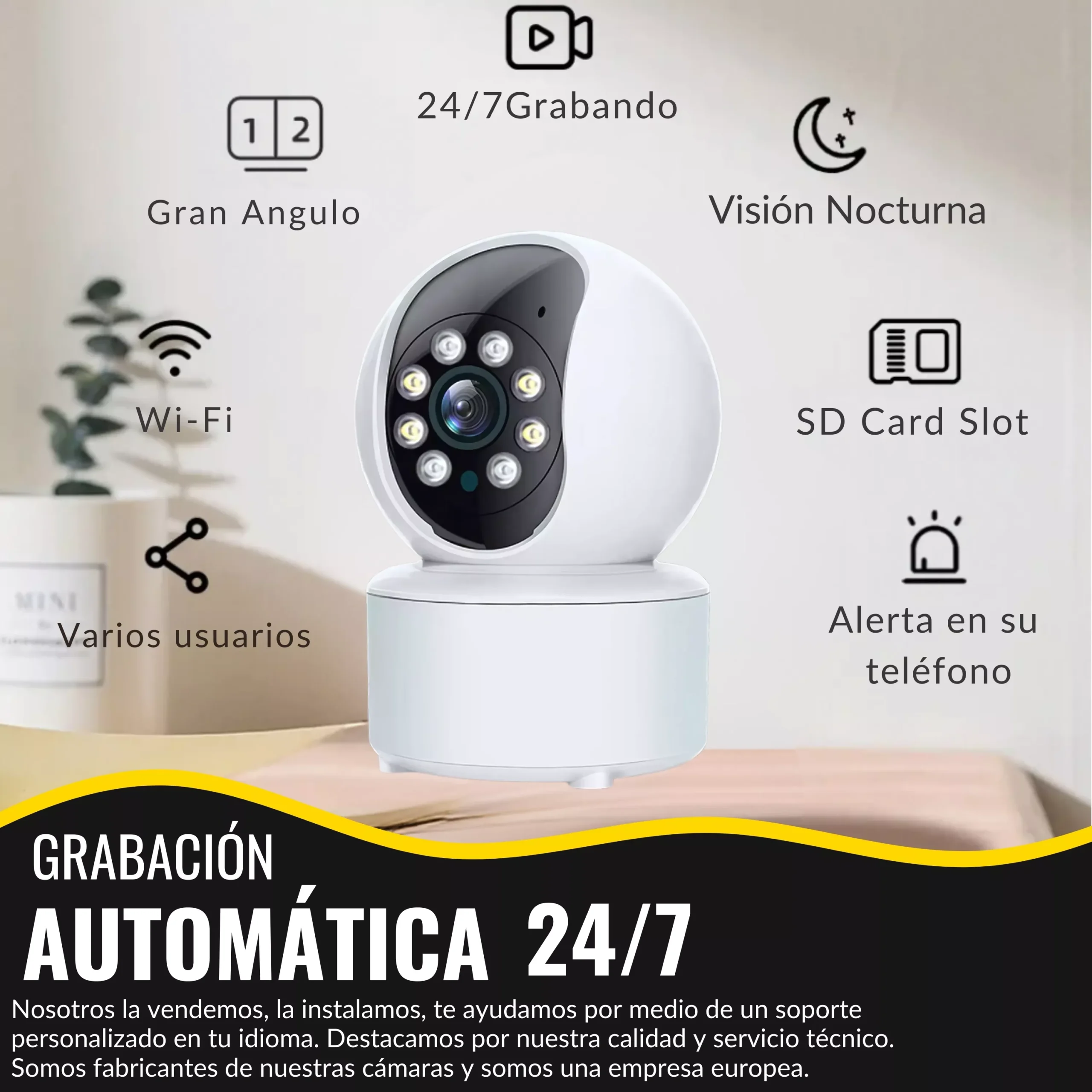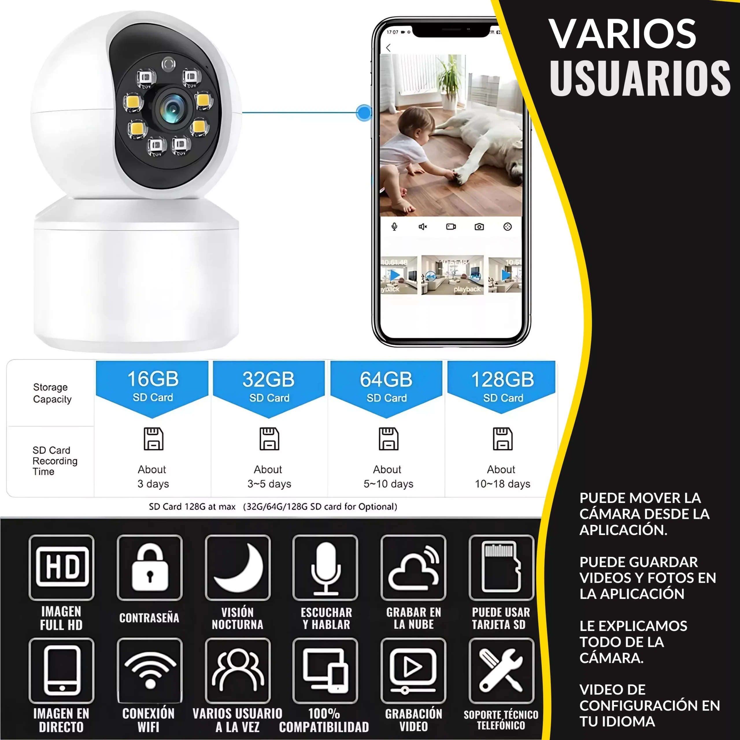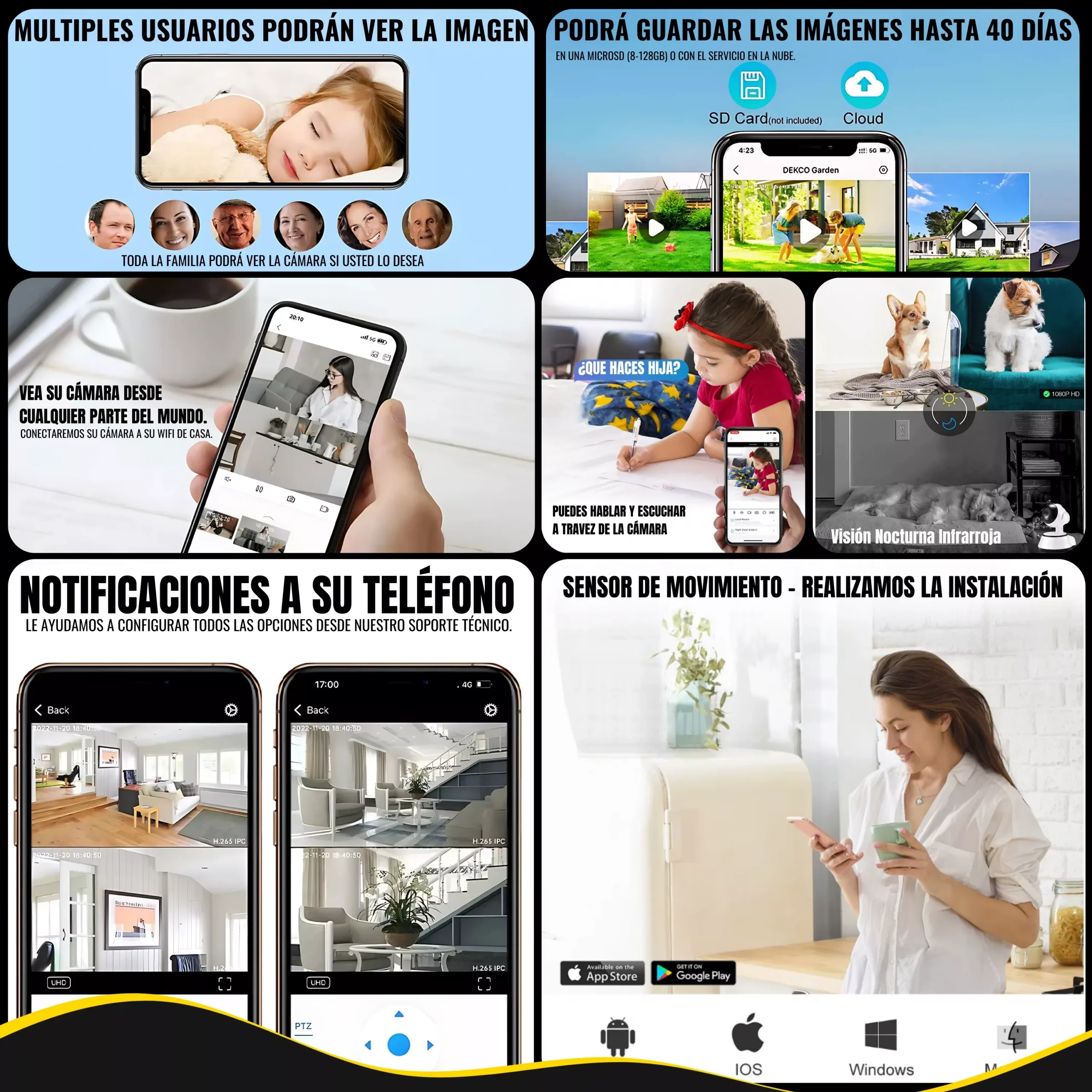 📹 VARIOS USUARIOS Y CÁMARAS + ALERTAS PERSONALIZADAS 📹 Su cámara de vigilancia interior exterior, podrá ser vista por varios usuarios si así lo quiere, también podrá personalizar todas las opciones como las alertas al móvil, alertas de movimientos, grabaciones en la microSD o en la nube. Si contacta con el soporte técnico, el equipo de ayuda le dará UNA MICROSD DE REGALO.