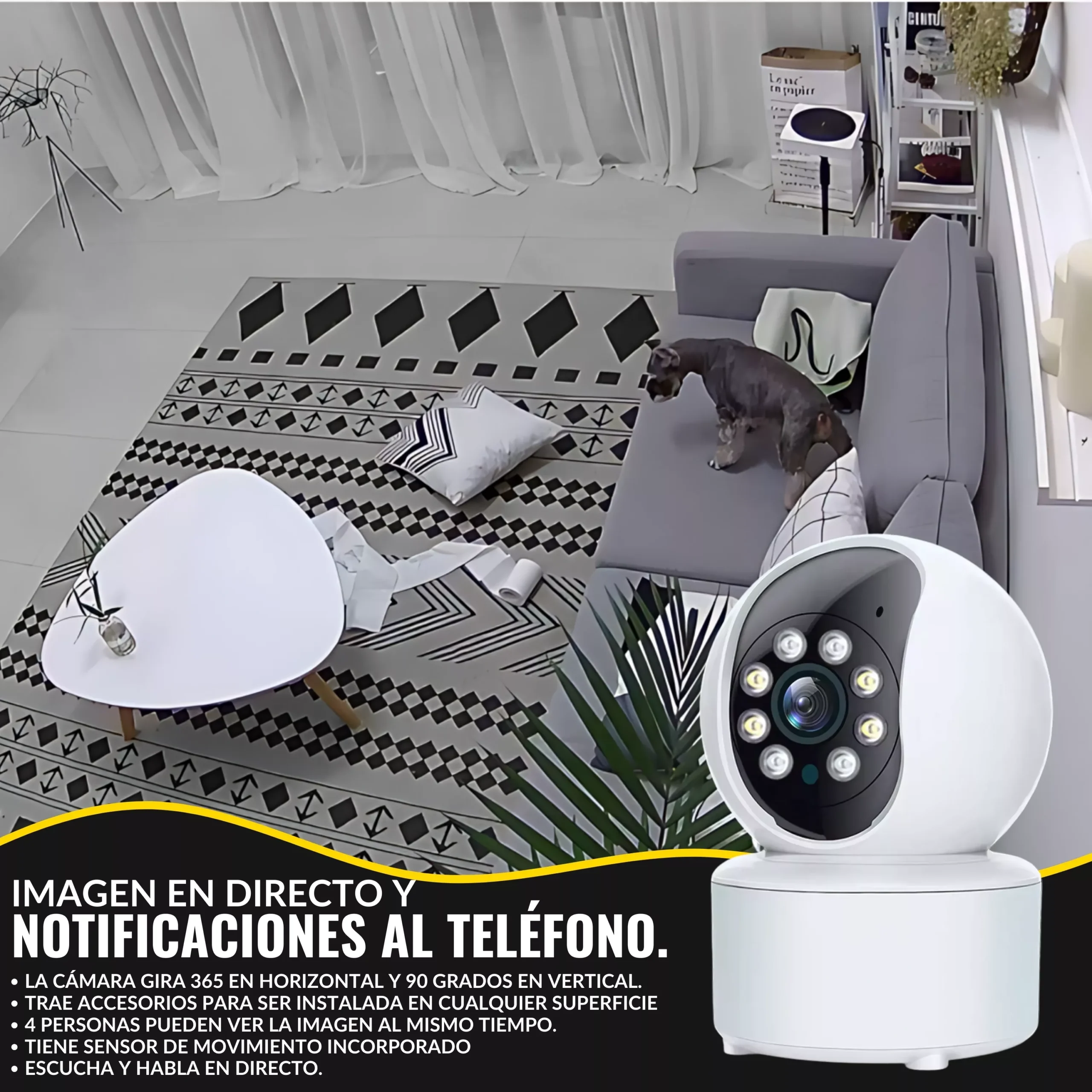 📹 NOTIFICACIONES AL MÓVIL + IMAGEN EN DIRECTO 📹 La cámara wifi vigilancia interior siempre tendrá la imagen en directo. También nuestras cámaras vigilancia domicilio wifi incorporan la posibilidad de hacer un pequeño circuito de vigilancia incorporando varias cámaras en la aplicación y pudiendo ver estas en directo al mismo tiempo en varios dispositivos. Si así lo desea, podrás añadir varias personas para ver su cámara.