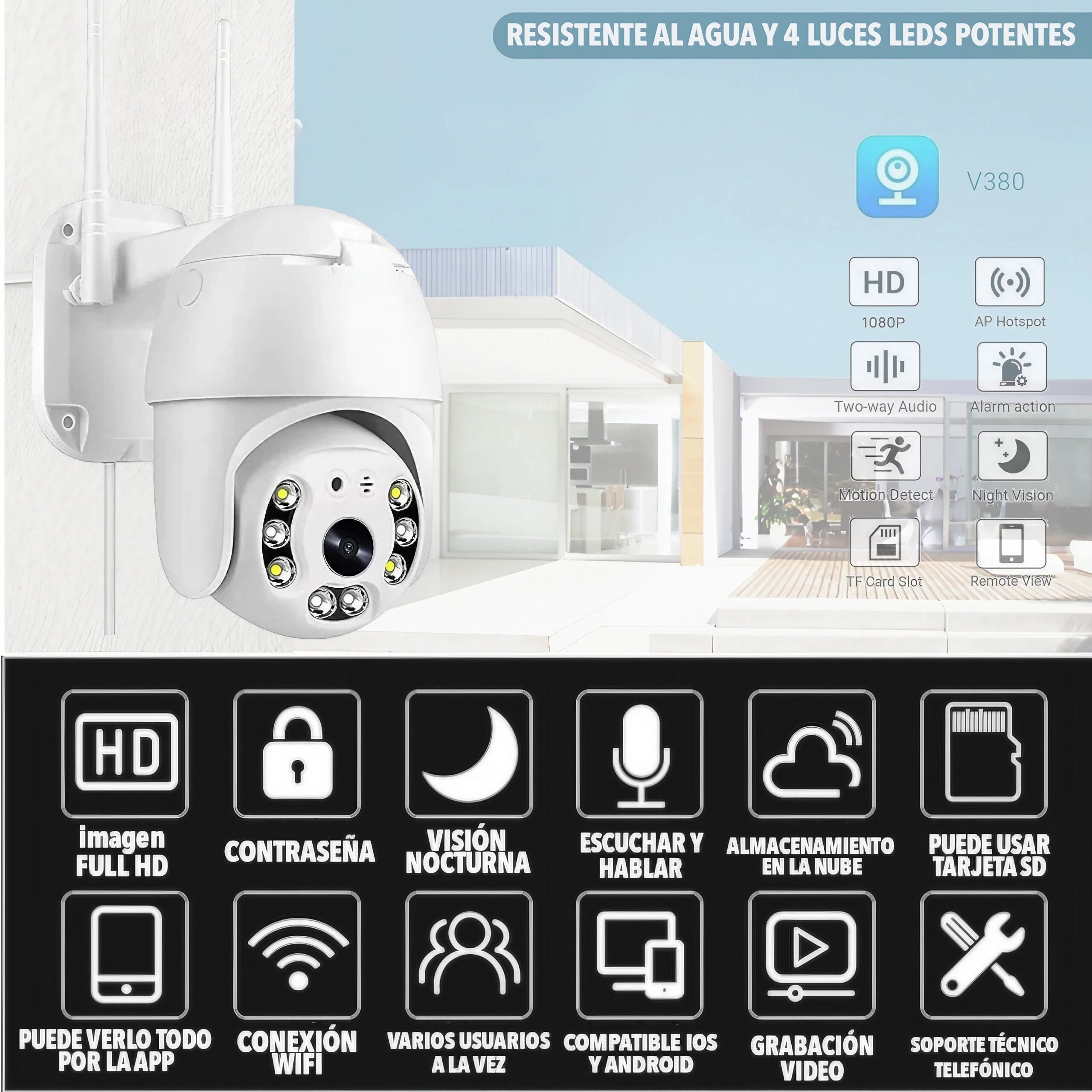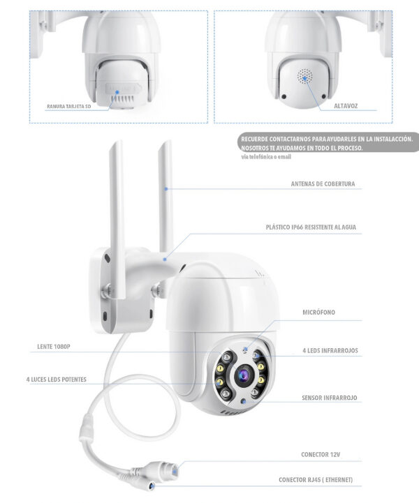 🔐 IMAGEN FULL HD CON SENSOR DE MOVIMIENTO 🔐 La Cámara wifi exterior tiene la imagen de 1920 x 1080 p (la imagen es espectacular). También, la cámara incorpora un sensor de movimiento, acompañado de +4 potentes luces leds y una alarma potente para ahuyentar a los intrusos. Puede automatizar todo su funcionamiento. Nosotros configuramos todo desde nuestro soporte técnico.