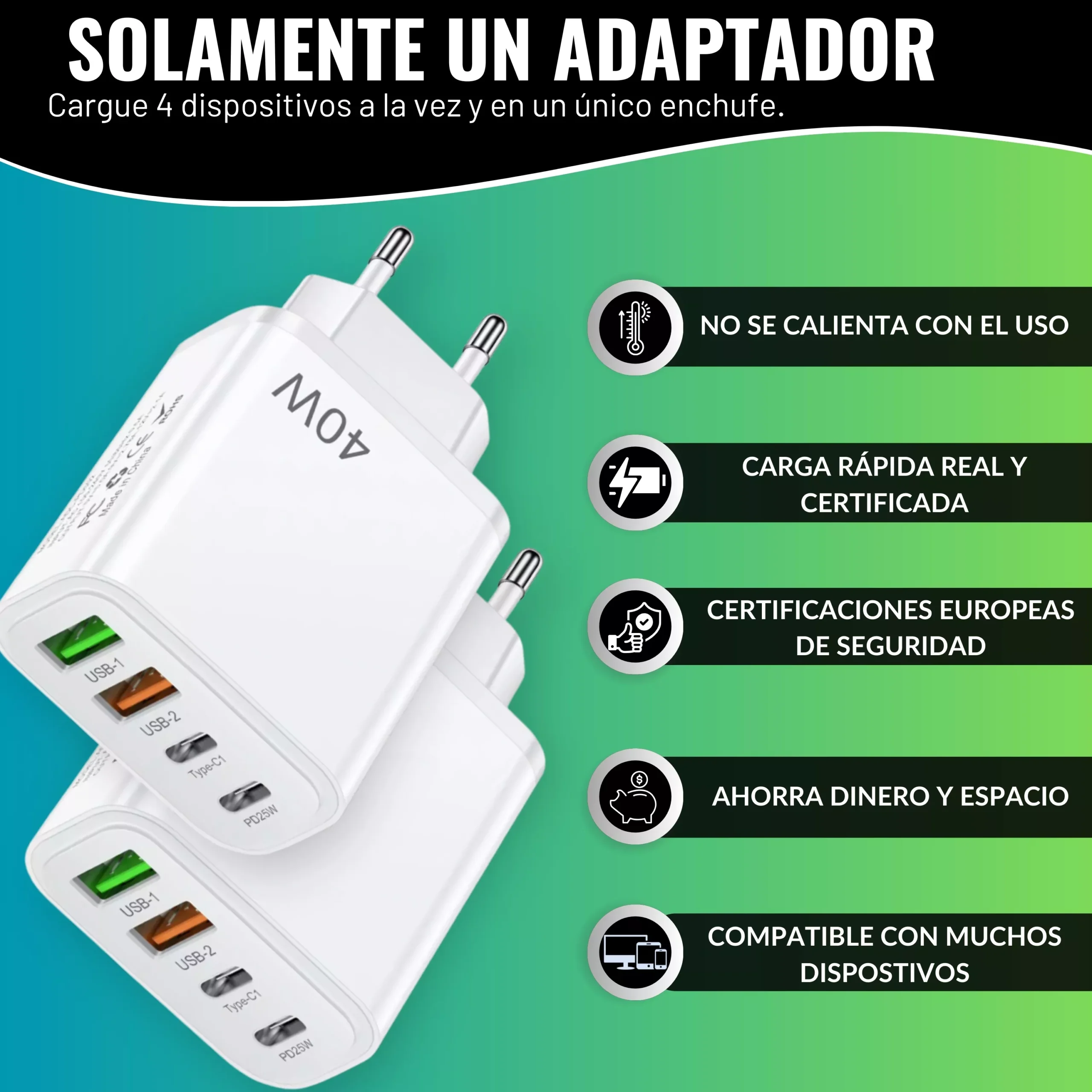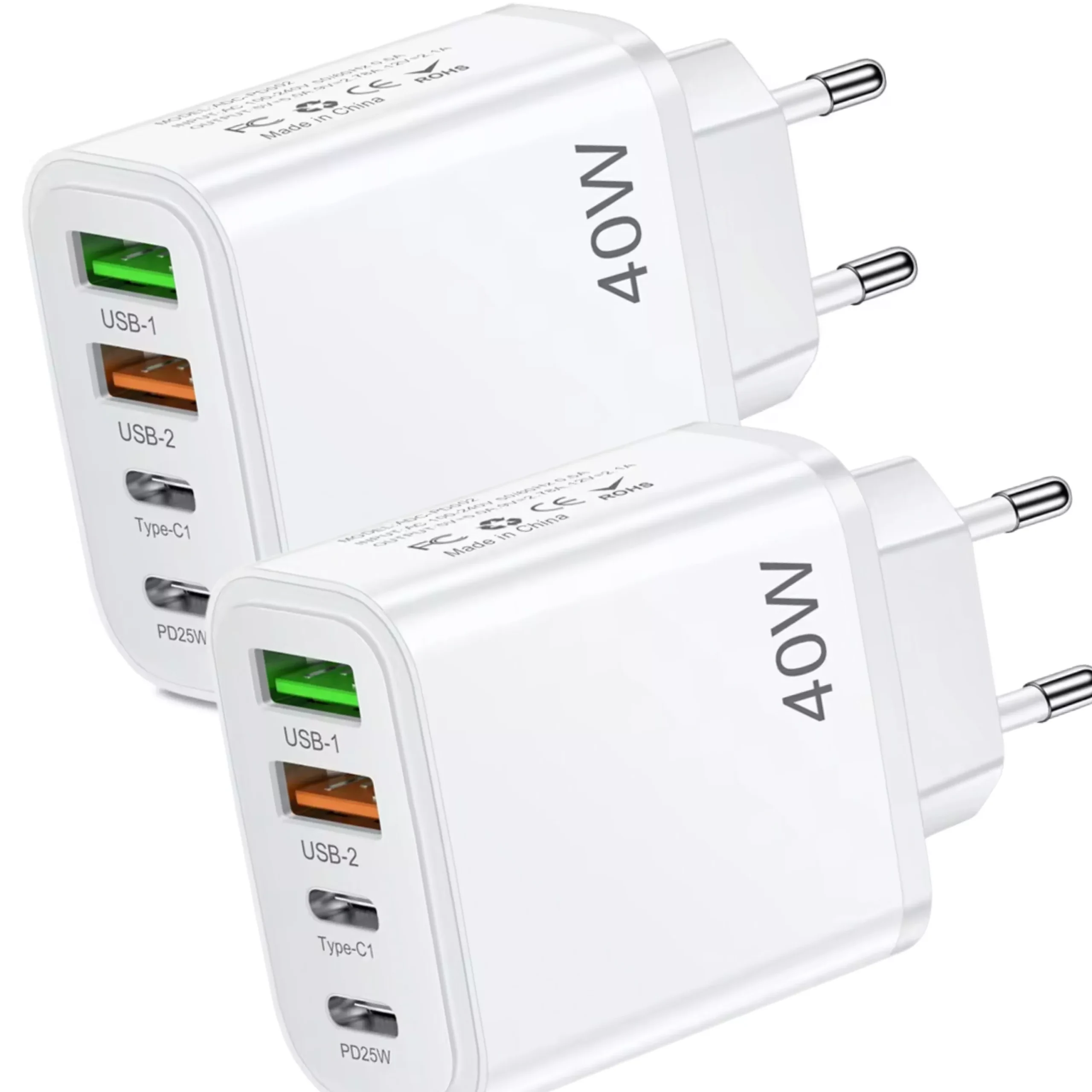 Pack 2 Cargador USB C Carga Rápida – Enchufe Multiple 40 W – Cargador Móvil USB Múltiple 4 Puertos – Adaptador USB C Compatible con Samsung, iPhone – iPad, Google, Carga Rapida, Portátil 40W