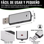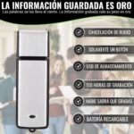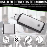 - ⭐️ GRABADORA ESPIA GRABE SIN SER VISTO POR MÁS DE 150 HORAS ⭐️ Mini Microfóno Espía de audio es muy parecido a un USB tradicional; nadie sospecharía que está grabando la conversación. La grabadora de voz profesional de 8 Gb podrá grabar por más de 150 horas. Es fácilmente recargable y su batería dura un aproximado de 8 horas.