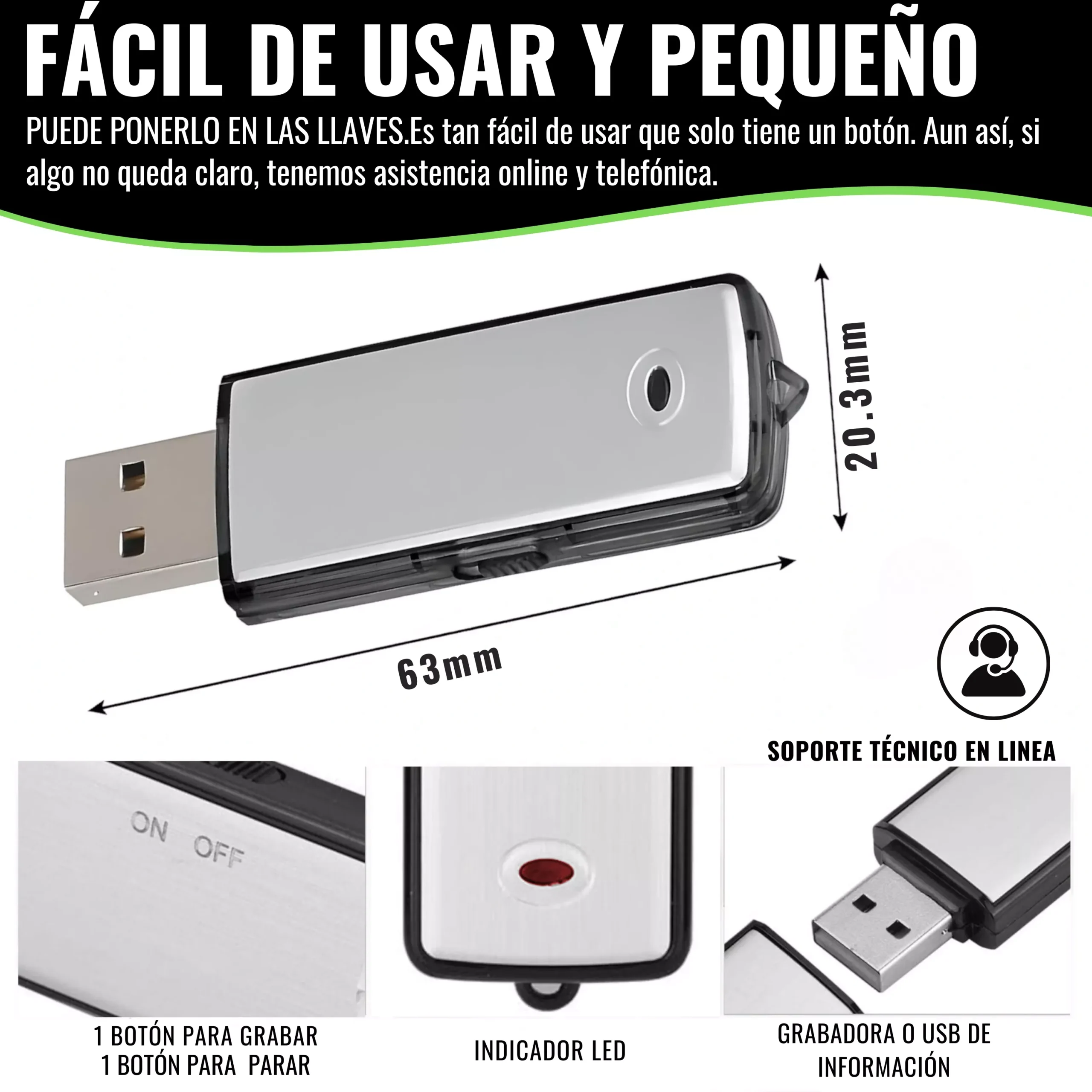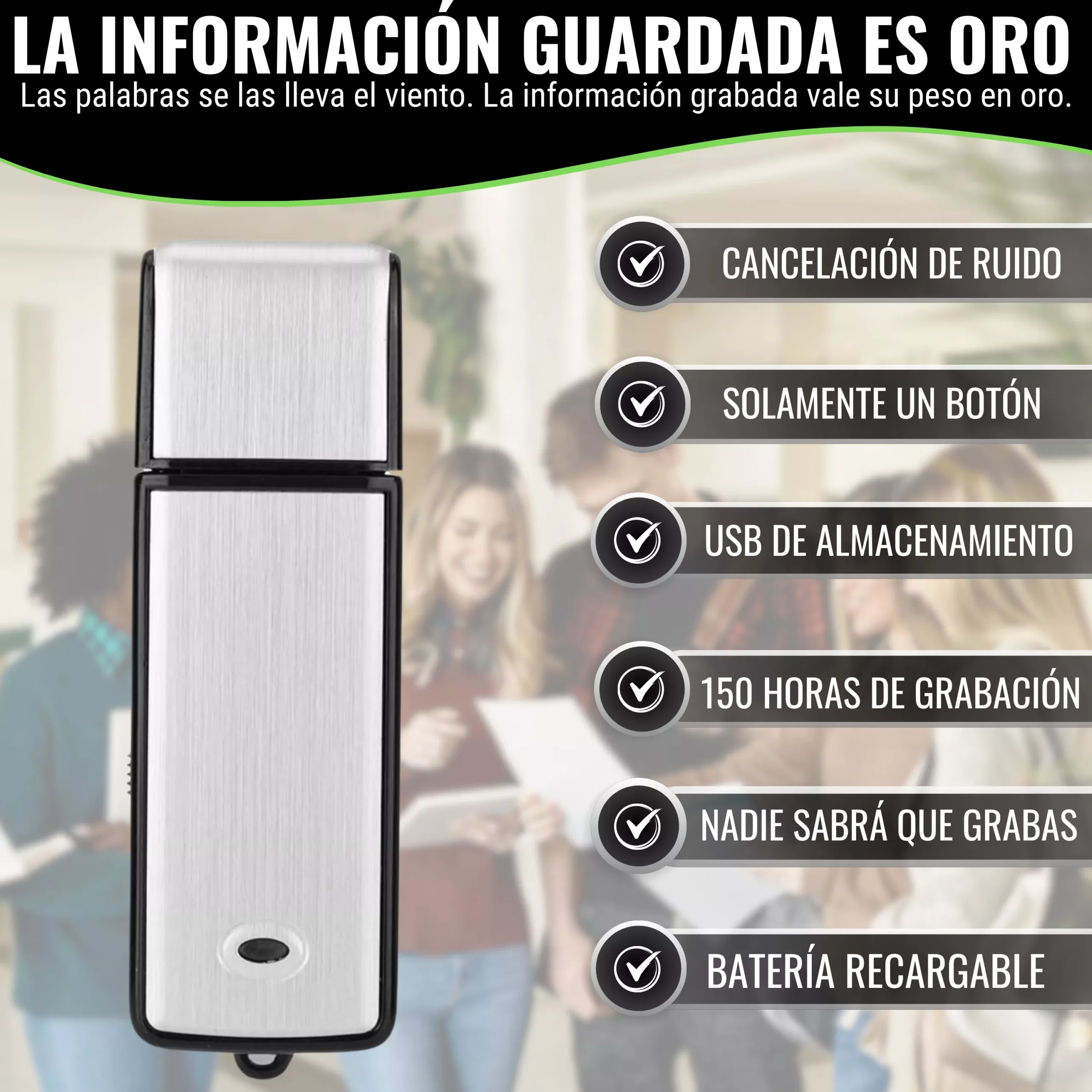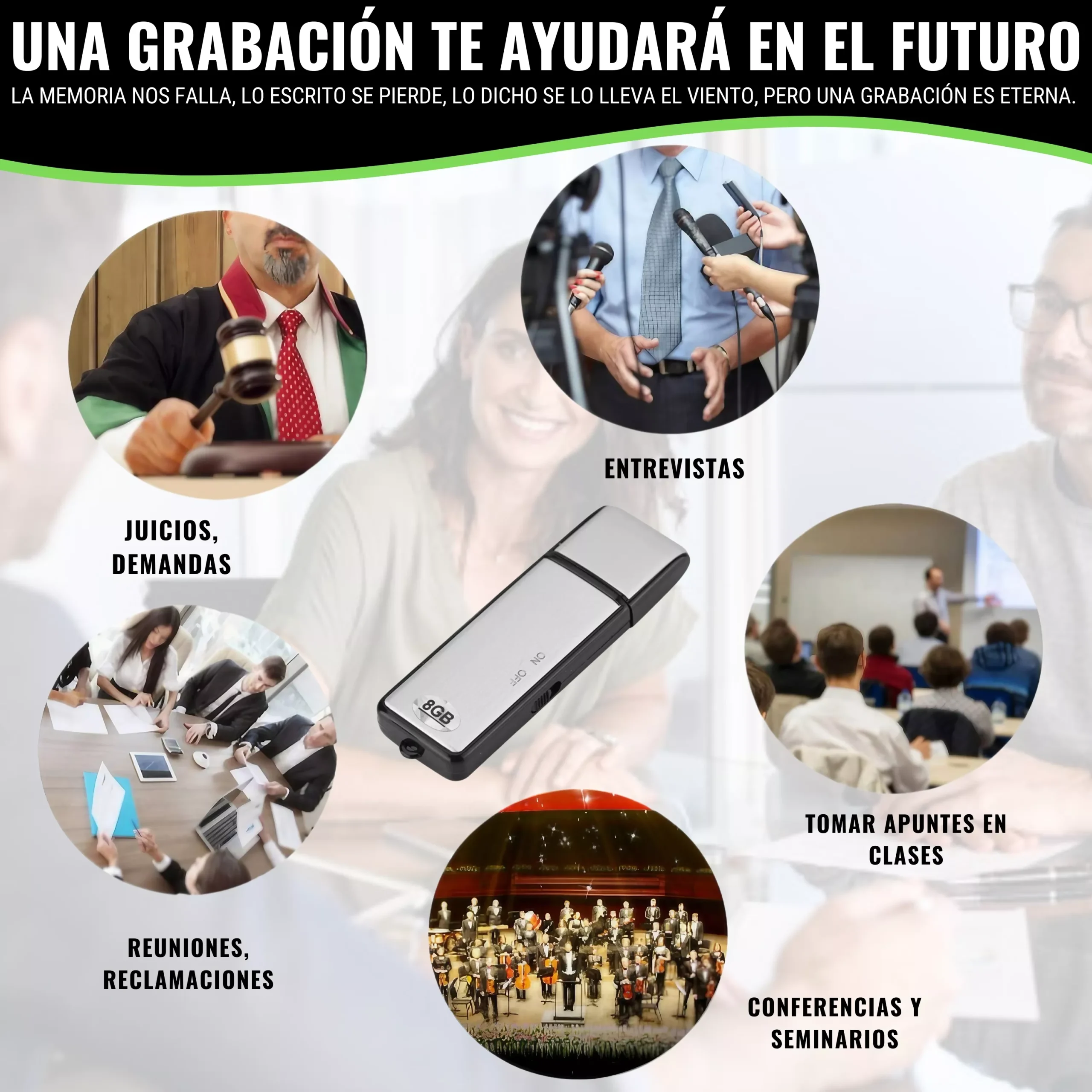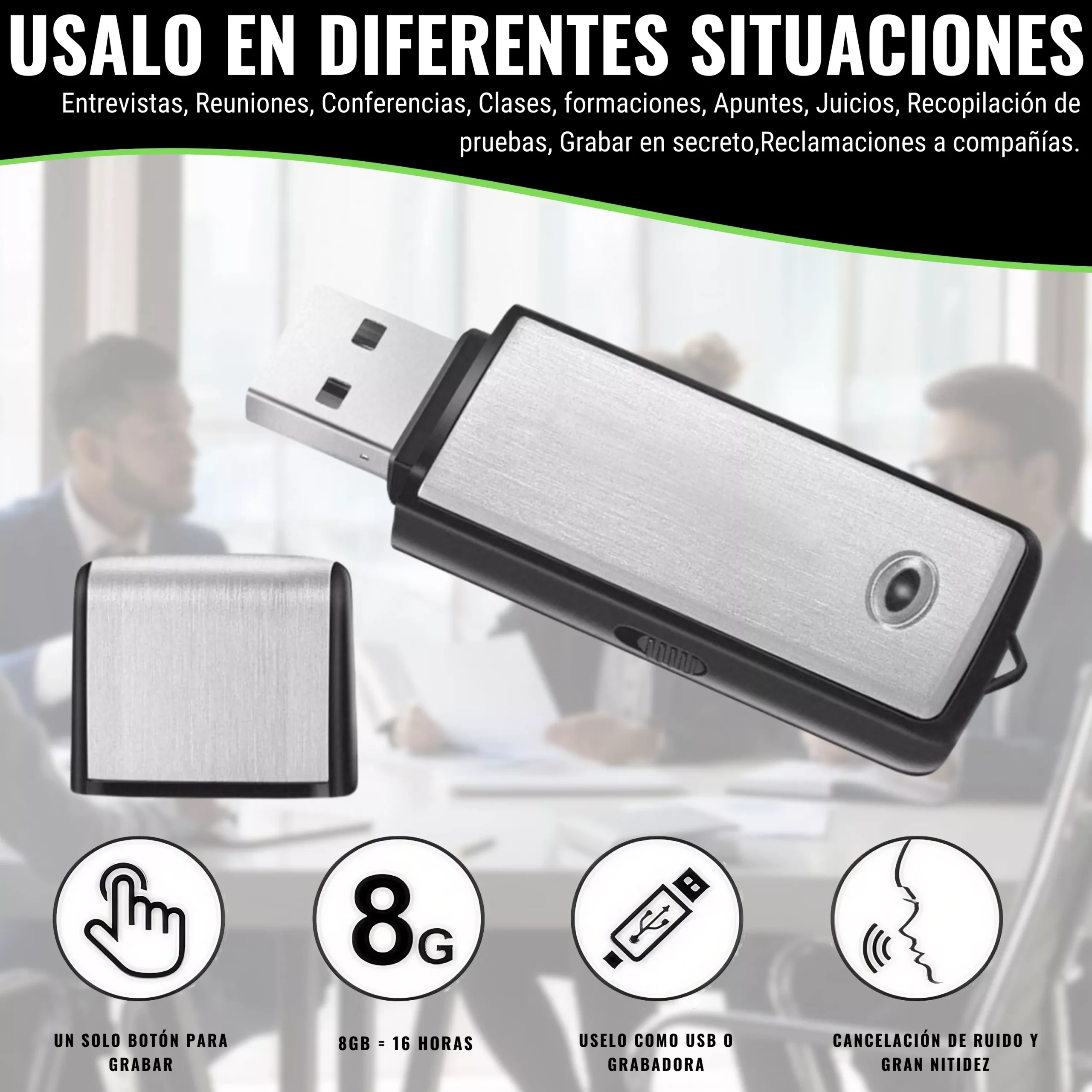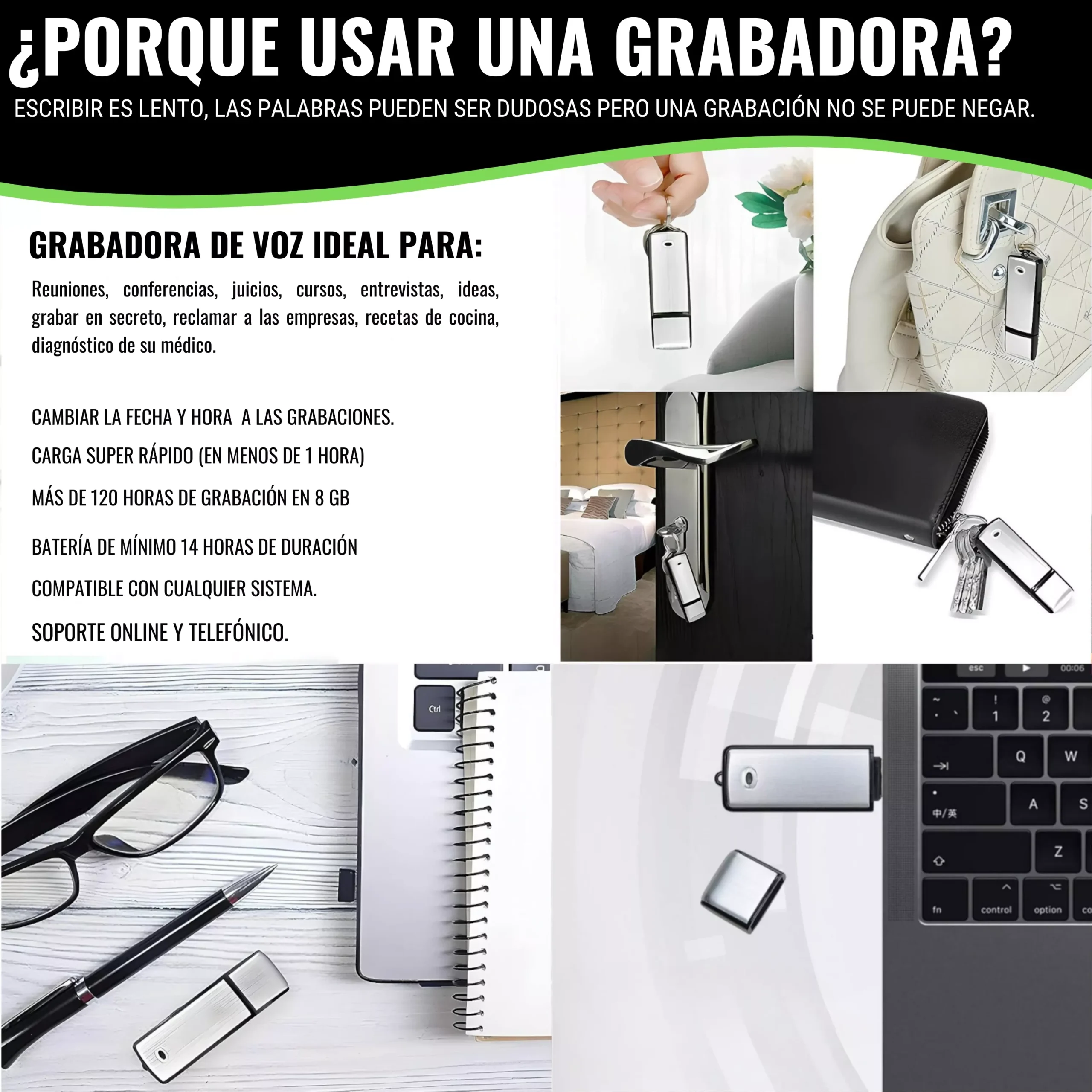 - ⭐️ GRABADORA LA INFORMACIÓN GRABADA ES ORO⭐️ Grabadora de voz Espía puede usarla en reuniones, conferencias, entrevistas, para grabar las clases, tomar apuntes rápidamente, en asuntos judiciales o policiales, para grabar lo que dice su médico, su abogado, sus ensayos musicales, sus ideas para los libros, para grabar sus conferencias, etc. Mini grabadora que va bien para recreación, conversaciones, trabajo y estudio, etc. También puede ser usada como USB de almacenamiento.